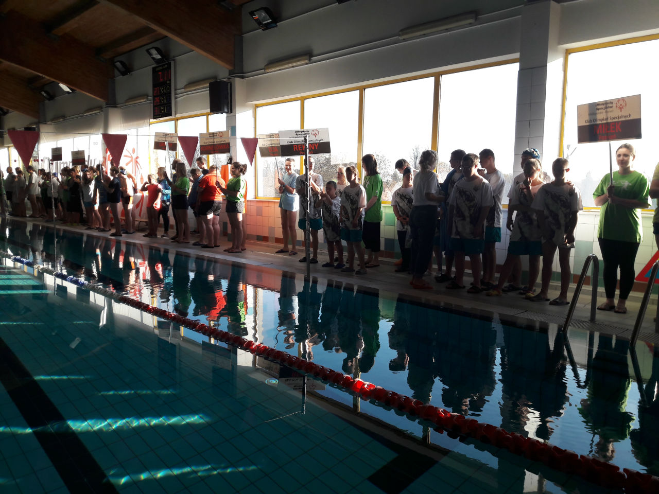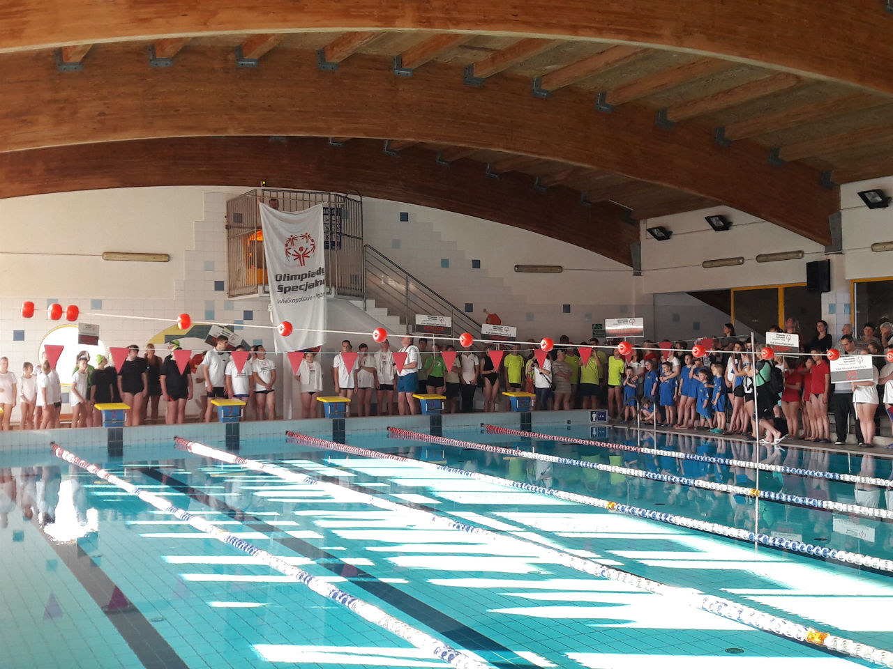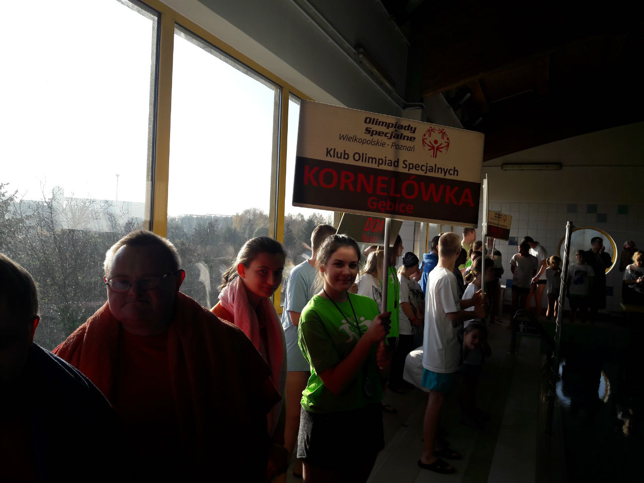 7 listopada br. w Szamotułach, odbył się XXII Regionalny Mityng Pływacki Olimpiad Specjalnych. Ta coroczna edycja zawodów pływackich ponownie przyciągnęła do Szamotuł ogromną rzeszę uczniów i uczennic szkół specjalnych oraz podopiecznych warsztatów terapii zajęciowej i domów pomocy społecznej z całego województwa wielkopolskiego. Jak zwykle naszą szkołę reprezentowała uczennica Aleksandra Kasperek - nasza pływająca mistrzyni. Po dotarciu na krytą pływalnię w Szamotułach spotkaliśmy mamę Oli, która jak co roku przyjechała, aby dopingować i motywować swoją córkę. Po oficjalnej części i przemówieniach zaproszonych gości, nadszedł czas na wciągnięcie na maszt flagi Olimpiad Specjalnych Polska i na sportowe zmagania. Nasza zawodniczka wystartowała najpierw na dystansie 50 m. stylem dowolnym (były to kraul na piersiach), osiągając drugi czas swojego biegu, dzięki czemu zdobyła srebrny medal. Po półtoragodzinnej przerwie odbył się drugi start Oli - tym razem na dystansie 25 m. kraulem. Zdenerwowani, ściskając za Aleksandrę kciuki, krzyczeliśmy głośno podczas jej konkurencji, aby jeszcze bardziej ją zmobilizować. Reprezentantka Gębickiej Kornelówki płynęła jak ryba co sił i znów wywalczyła srebrny medal. Zadyszana, lecz szczęśliwa, po raz drugi tego dnia stanęła na drugim stopniu podium. Po zakończonych zawodach, wszyscy zjedli smaczny i pożywny posiłek przygotowany przez szamotulski Hotel Maraton oraz zrobili pamiątkowe zdjęcie.