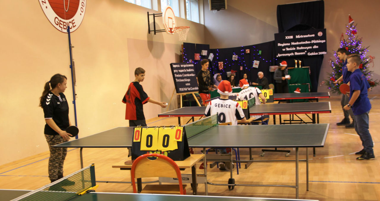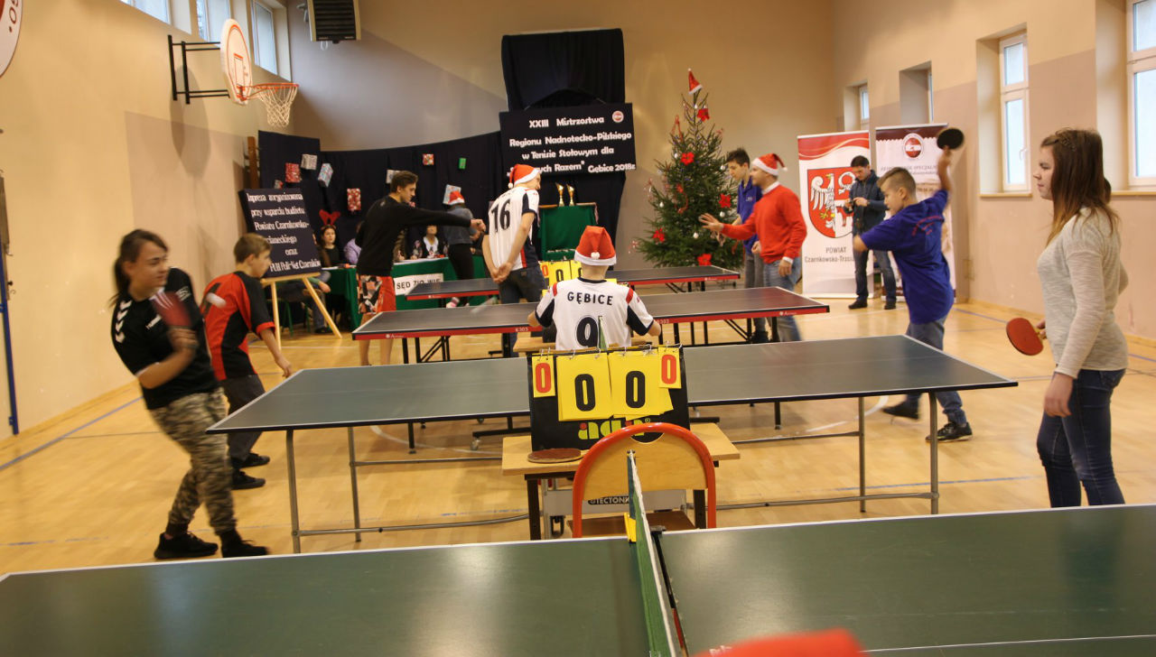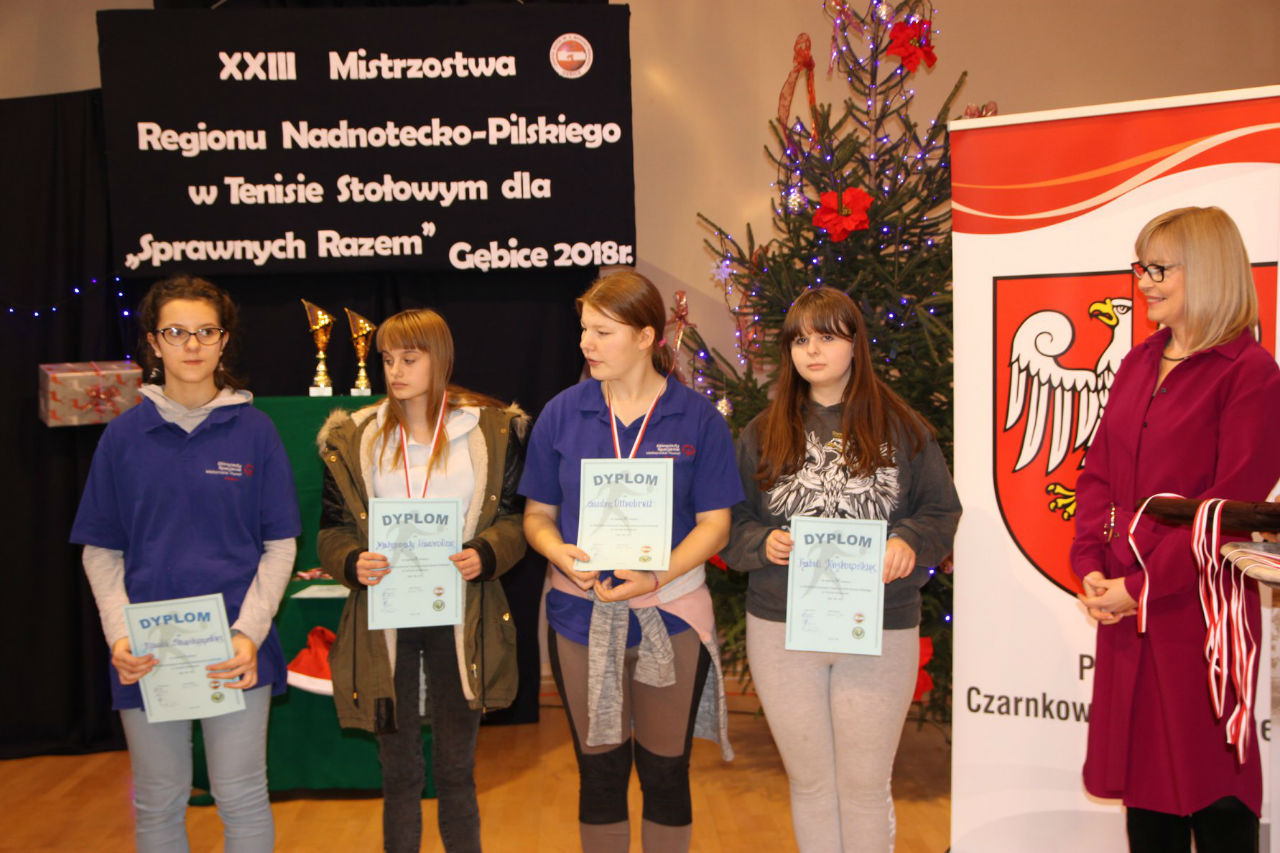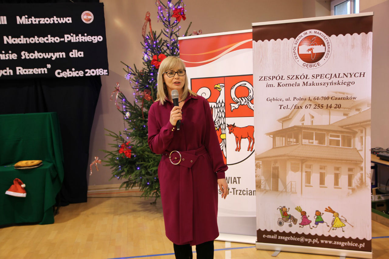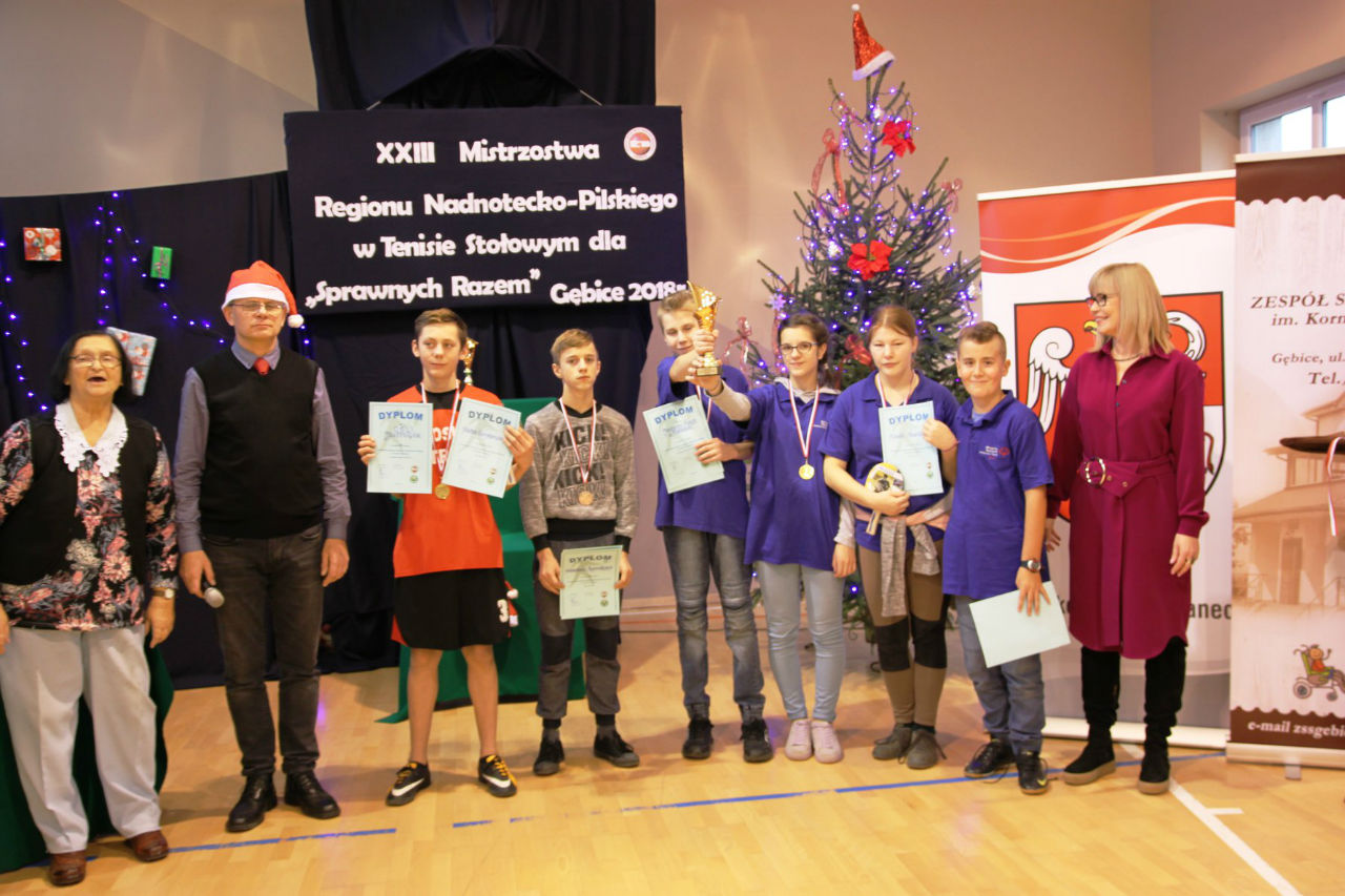 06 grudnia 2018 roku w Zespole Szkół im. Kornela Makuszyńskiego w Gębicach odbyły się XXIII Mistrzostwa Regionu Nadnotecko – Pilskiego dla „Sprawni – Razem" w Tenisie Stołowym. Kolejny raz ta impreza została sfinansowana przez Powiat Czarnkowsko - Trzcianecki oraz PHU Poli – Vet Sp. z o.o. w Czarnkowie. Podczas otwarcia zawodów byli obecni zaproszeni goście: prezes Związku Stowarzyszeń Społeczno-Sportowych – p. Aleksandra Błażejewska oraz wiceprezes tego stowarzyszenia – p. Jerzy Kucharski. Pani Aleksandra Błażejewska przedstawiła grupy sportowe wraz z ich opiekunami,