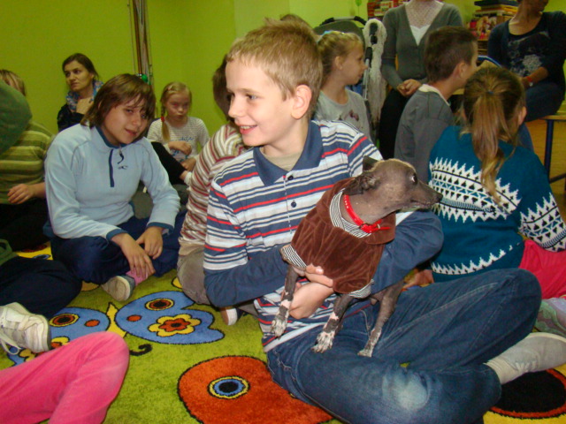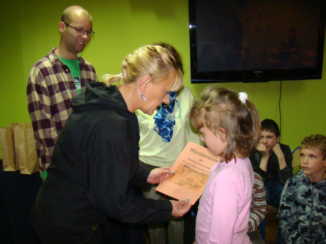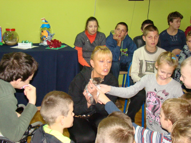 Wyniki konkursu ogłoszono podczas spotkania z niecodziennymi gośćmi, którzy 6 października odwiedzili naszą szkołę. Dzięki życzliwości pani Iwonie Kostrzewa-Lewińskiej, właścicielki sklepu zoologicznego, opiekunki porzuconych zwierząt, a przede wszystkim wielkiej ich miłośniczki mieliśmy okazję zobaczyć i pogłaskać nagiego psa meksykańskiego, świnkę morską rasy skinny, gekona lamparciego, kocię domowe, żółwia wodno – lądowego oraz bojownika wspaniałego (syjamskiego). Ponadto pani Iwona przekazała nam najważniejsze informację dotyczące hodowli prezentowanych zwierząt.