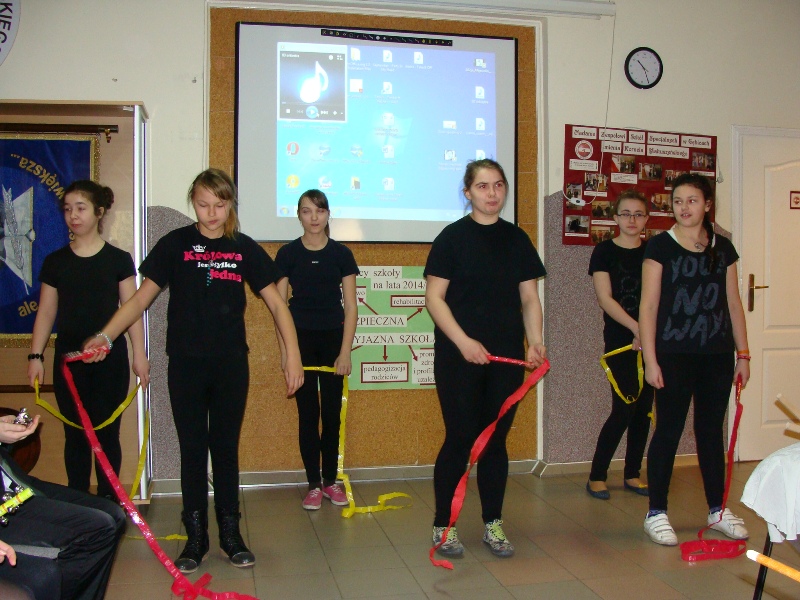 Dalsza część spotkania dotyczyła historii spódnic. Jedna z uczennic przedstawiła nam prezentację multimedialną na temat początków spódnicy oraz różnych jej fasonów. Następnie uczennice gimnazjum zaprezentowały się w spódnicach uszytych przez siebie na zajęciach technicznych. W spódnice ubrali się również chłopcy, którym nie zabrakło odwagi, żeby się pokazać na forum - zostali nagrodzeni brawami i słodkościami. Jednak spośród wielu kolorowych, o różnych fasonach i długościach, spódnic wybrano jedną, kwiecistą i długą, w którą ubrana była uczennica kl. Iż Adrianna Jyrgaś. Zwyciężczyni otrzymała dyplom z tytułem Super Spódnica i dużą czekoladę. Dyplom z tytułem Spódnica Roku i słodki upominek otrzymały także: pani Ewa Bals i uczennica kl. IIgż Róża Świerczyńska, które jako jedyne w szkole są wiernymi amatorkami tej części garderoby, ubierając ją codziennie. Wspólny taniec w kole w rytmie piosenki „a ty pokaż swoje nogi, nogi….” zakończył tę niecodzienną uroczystość.