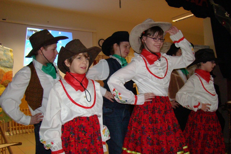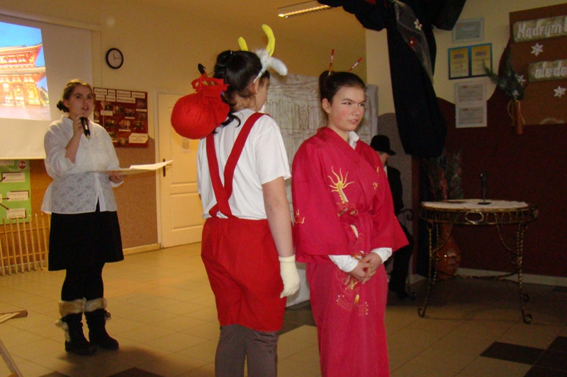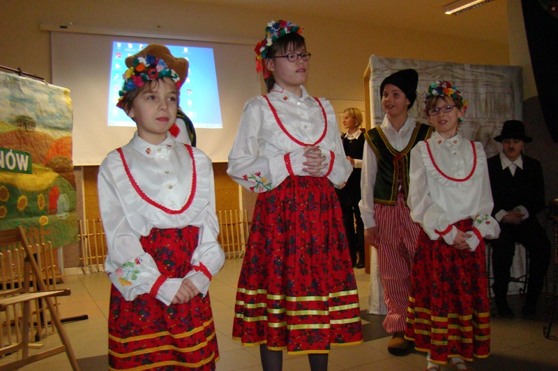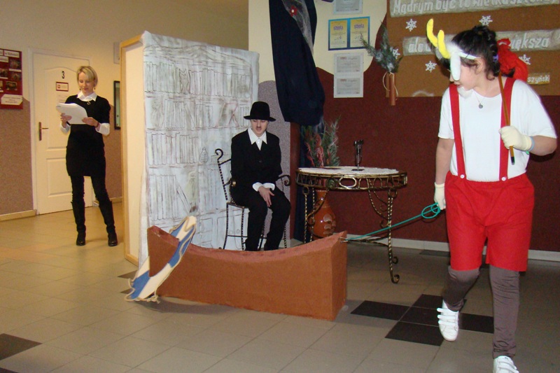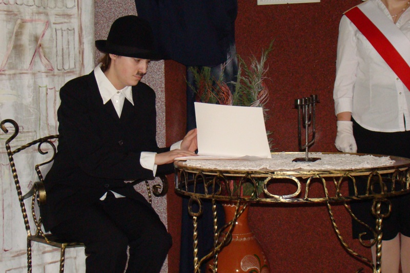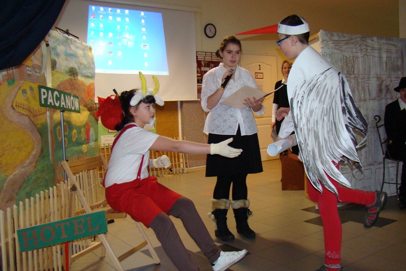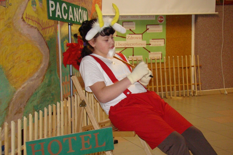 W drugiej części uroczystości mogliśmy obejrzeć inscenizację fragmentu ?Przygód Koziołka Matołka? w wykonaniu uczniów naszej szkoły. Główny bohater Koziołek Matołek, wybierając się do Pacanowa, odwiedzał różne kraje. Z każdej podróży wyciągał wnioski. Podsumowując, stwierdził jednak, że najlepiej jest w Polsce. W trakcie przedstawienia uczniowie najmłodszych klas zaprezentowali swoje talenty w tańcu kowbojskim, rosyjskim ?Kozaczoku? i w góralskim ?Trojaku?.
