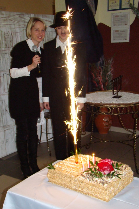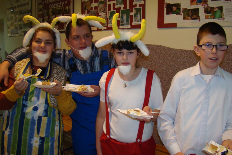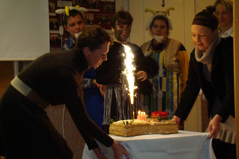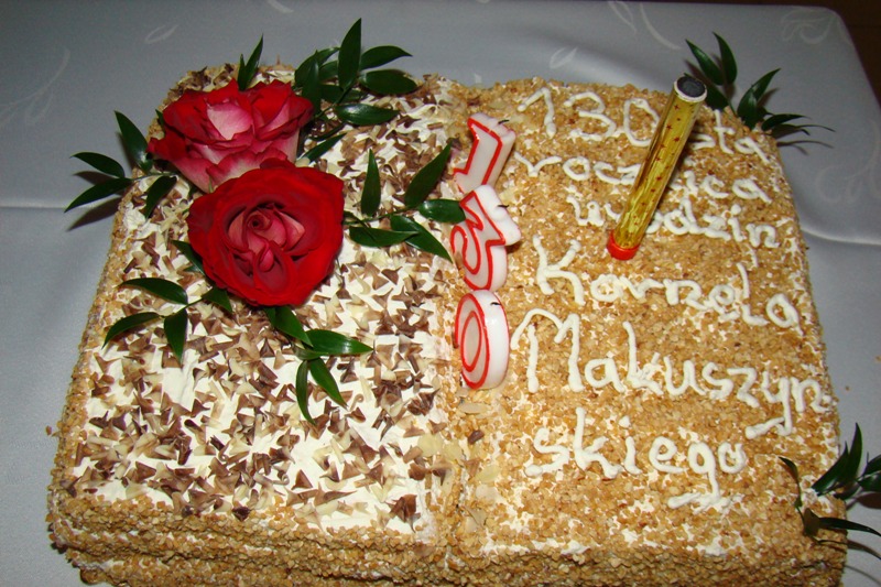 Uroczystość urodzinowa nie mogła obyć się bez tortu i odśpiewania przez całą społeczność szkolną ?Sto lat?. Szanowny Jubilat nie chciał świętować sam, zdmuchnął świeczki, a na tort zaprosił wszystkich uczniów i nauczycieli. Przepyszny tort urodzinowy był w kształcie książki, która miała zapraszać do częstszego sięgania po utwory naszego Patrona, bo jak sam pisał: ?Książka to cudo promieniste, to złota iskierka, to okruch serca, to promień wieczystego słońca, co świeci na drodze we wieczność. Ona jest z nami, kiedy jest smutno i śmieje się razem z nami?? .
