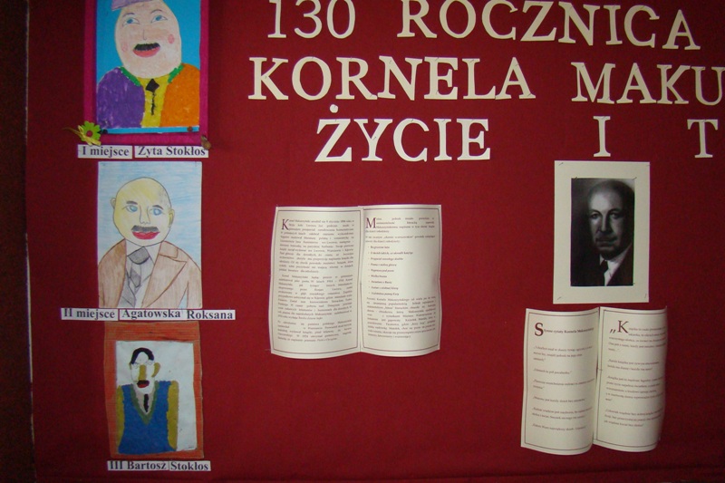 Po części oficjalnej przyszedł czas na podsumowanie konkursu plastycznego - ?Portret Kornela Makuszyńskiego?. Zwycięzcom dyplomy i nagrody wręczała pani wicedyrektor Izabela Rybarczyk. Nagrodzeni zostali: Zyta Stokłos (I miejsce), Roksana Agatowska (II miejsce), Bartłomiej Stokłos (III miejsce). Wyróżnienia otrzymali: Sandra Cholewińska, Paweł Budner.