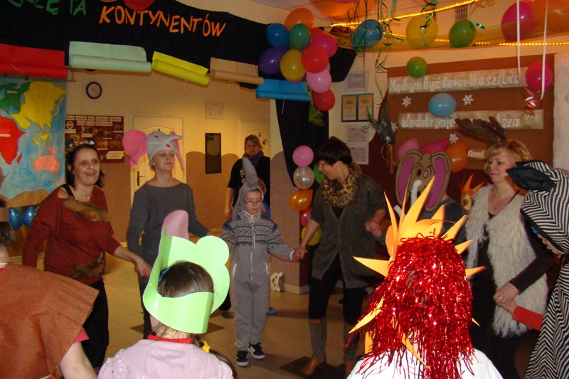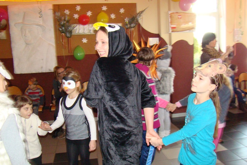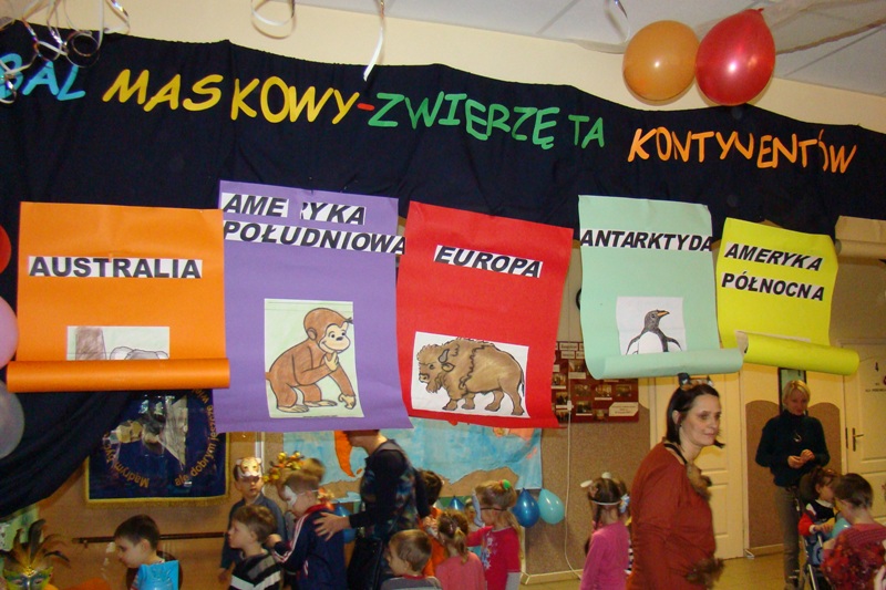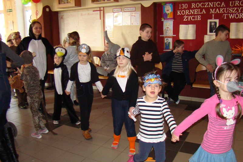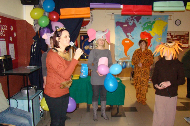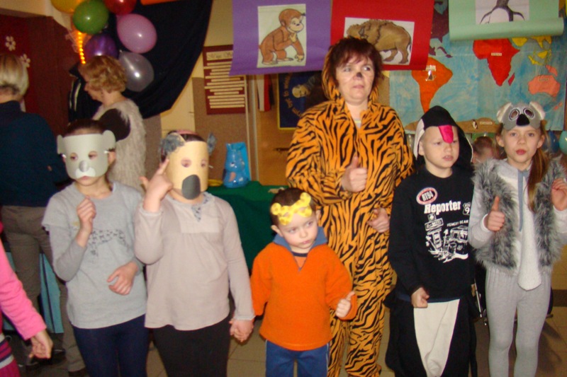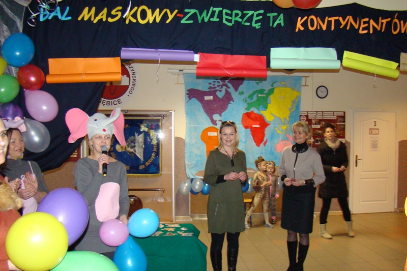 Na bal uczniowie przybyli w pięknych i oryginalnych strojach, przedstawiających różne zwierzęta zamieszkujące wszystkie kontynenty naszego globu. We wspólnym tańcu można było zobaczyć małpki, słonie, pingwiny, lwy, jelenie, niedźwiedzie i misie koala. W rytmie największych przebojów, prezentowanych przez DJ, wszyscy bawili się doskonale. Oddechem w tańcu okazały się, przygotowane przez organizatorki balu: p. Agnieszkę Roszak, p. Iwonę Lokert, p. Karolinę Rybarczyk, p. Annę Korczyc i p. M. Fąka, liczne konkursy, które tematycznie nawiązywały do hasła balu. Szczególnym zainteresowaniem cieszyły się konkurencje: najgłośniejszy ryk lwa, rzuty ringo na poroże jelenia, zjadanie bananów na czas, taniec pingwina czy polowanie na starego niedźwiedzia. Zwycięzców obdarowywano czekoladkami i cukierkami .
