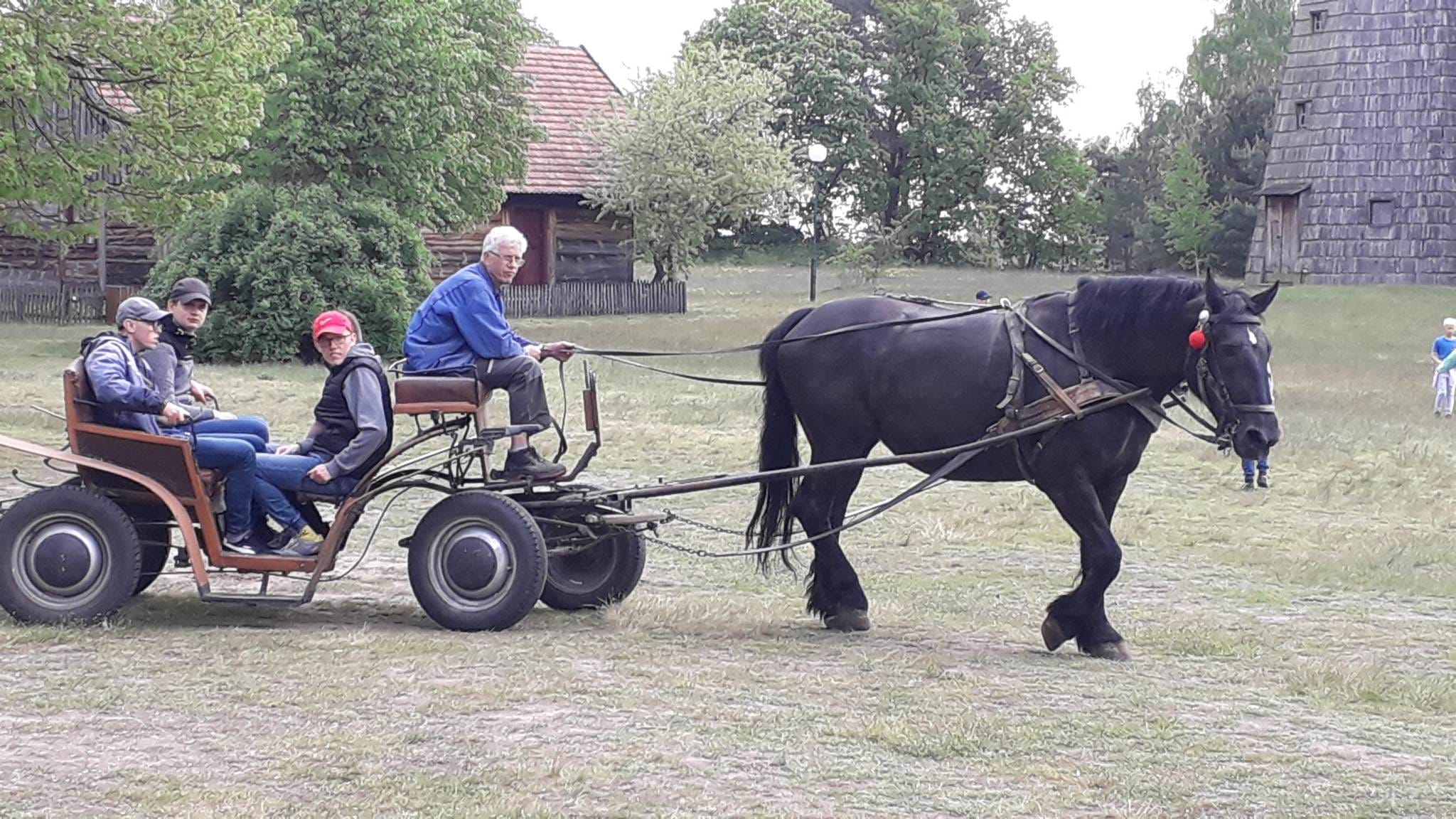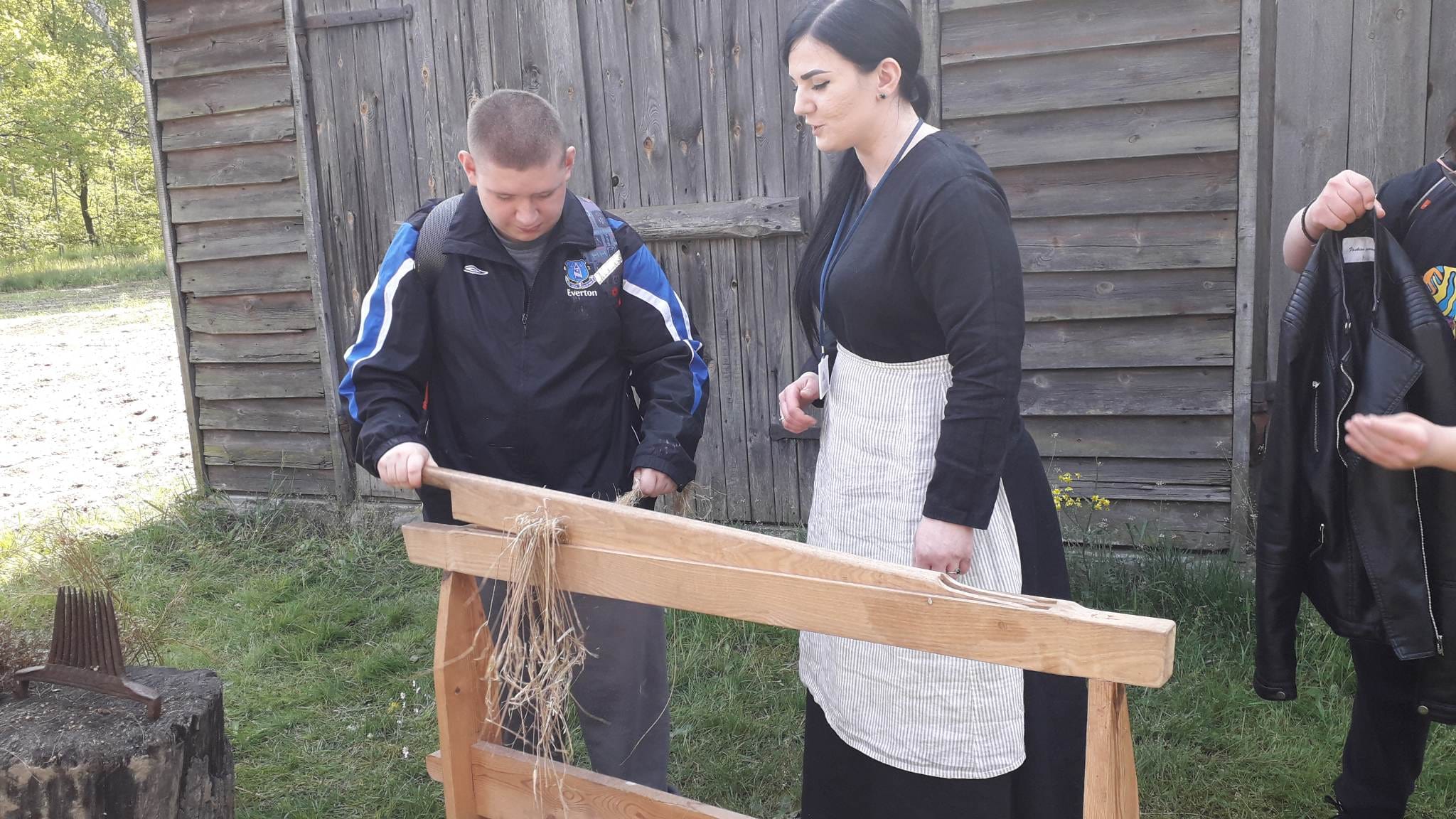 Mieliśmy także możliwość uczestniczenia w pokazie wyrobu włókien lnianych. Zaprezentowano nam narzędzia i sposób wytwarzania oraz wyczesywania włókien lnianych. Na zakończenie mogliśmy przejechać się bryczką wokół wsi na terenie skansenu oraz zakupić pamiątki.